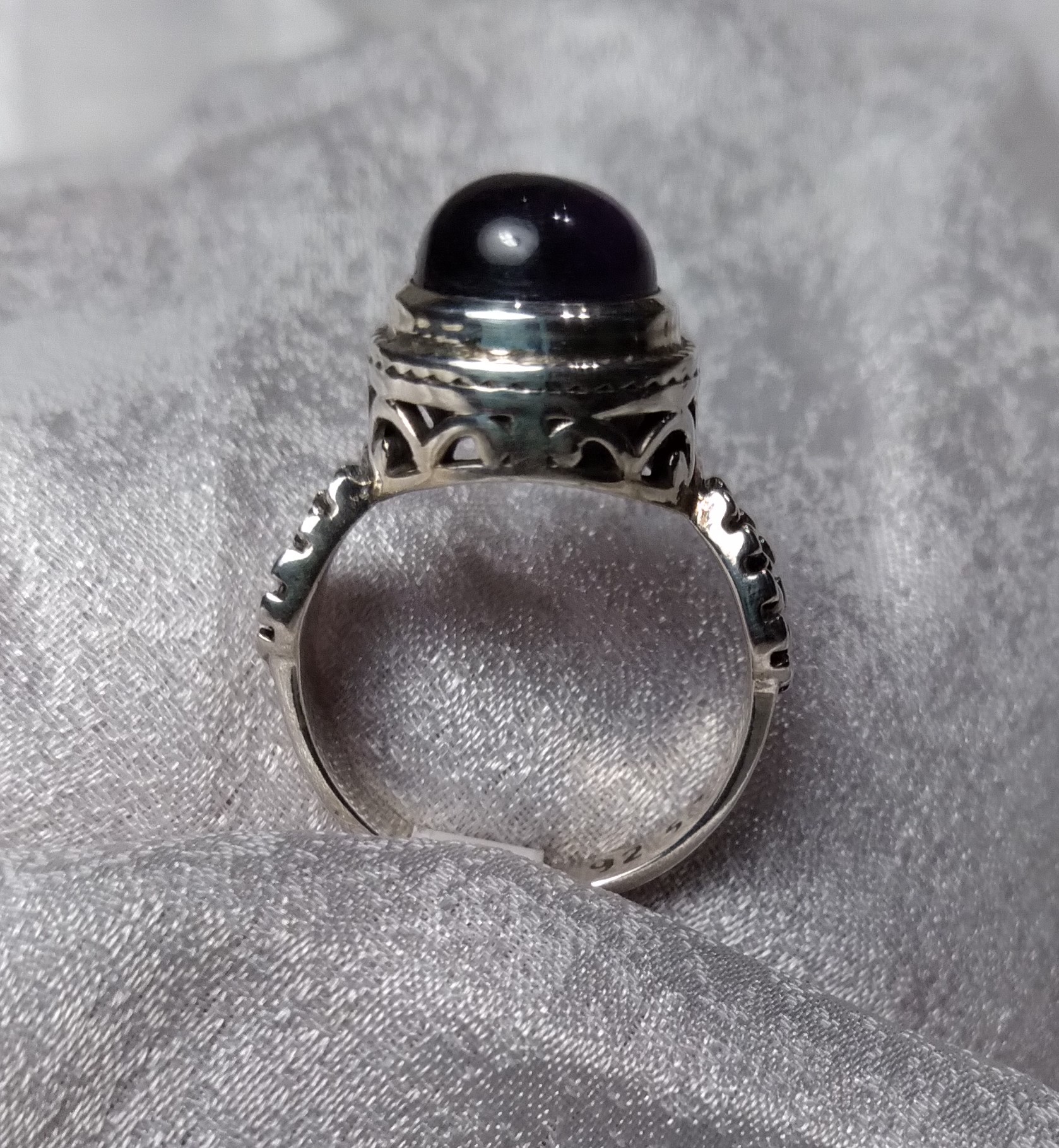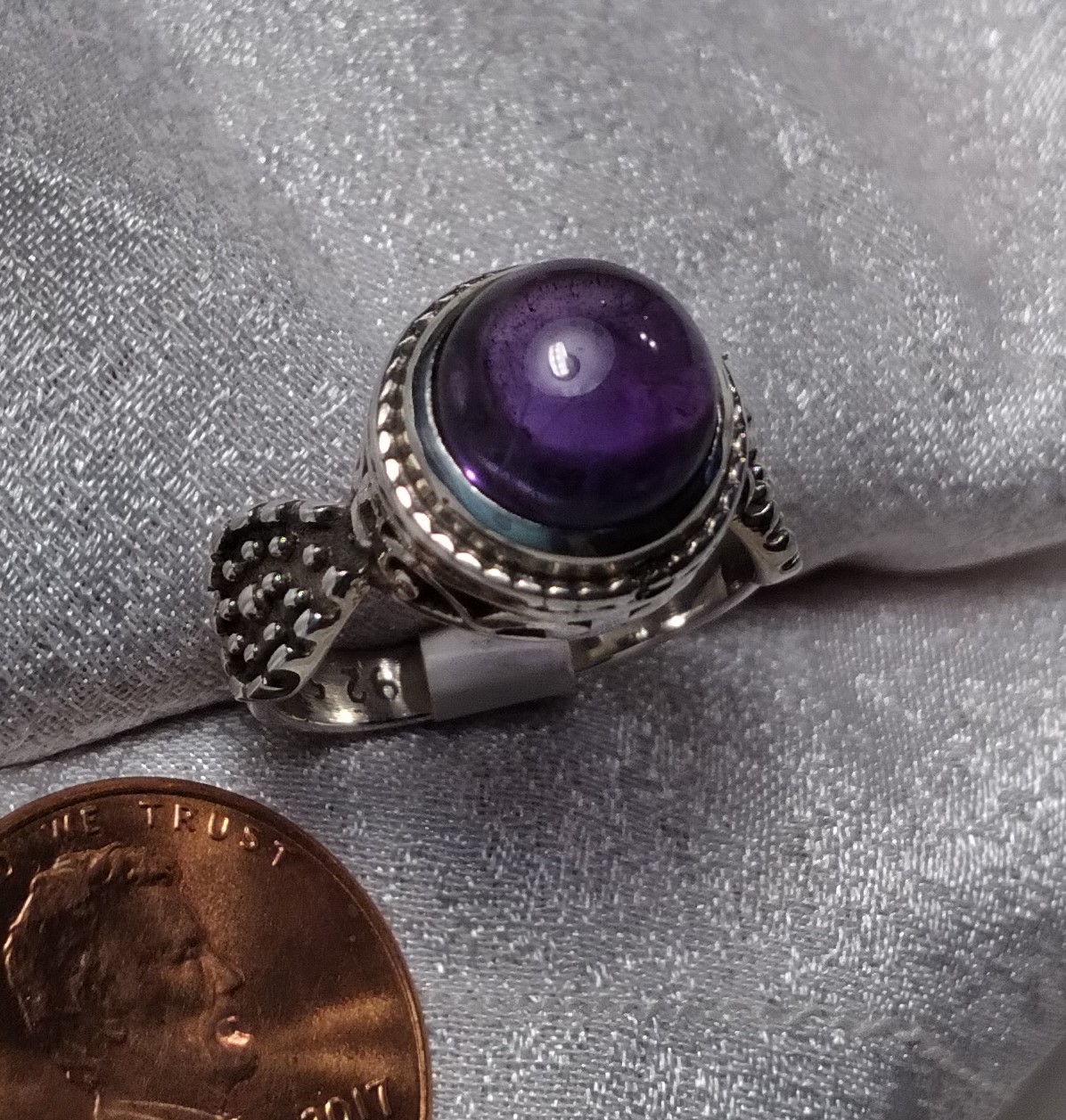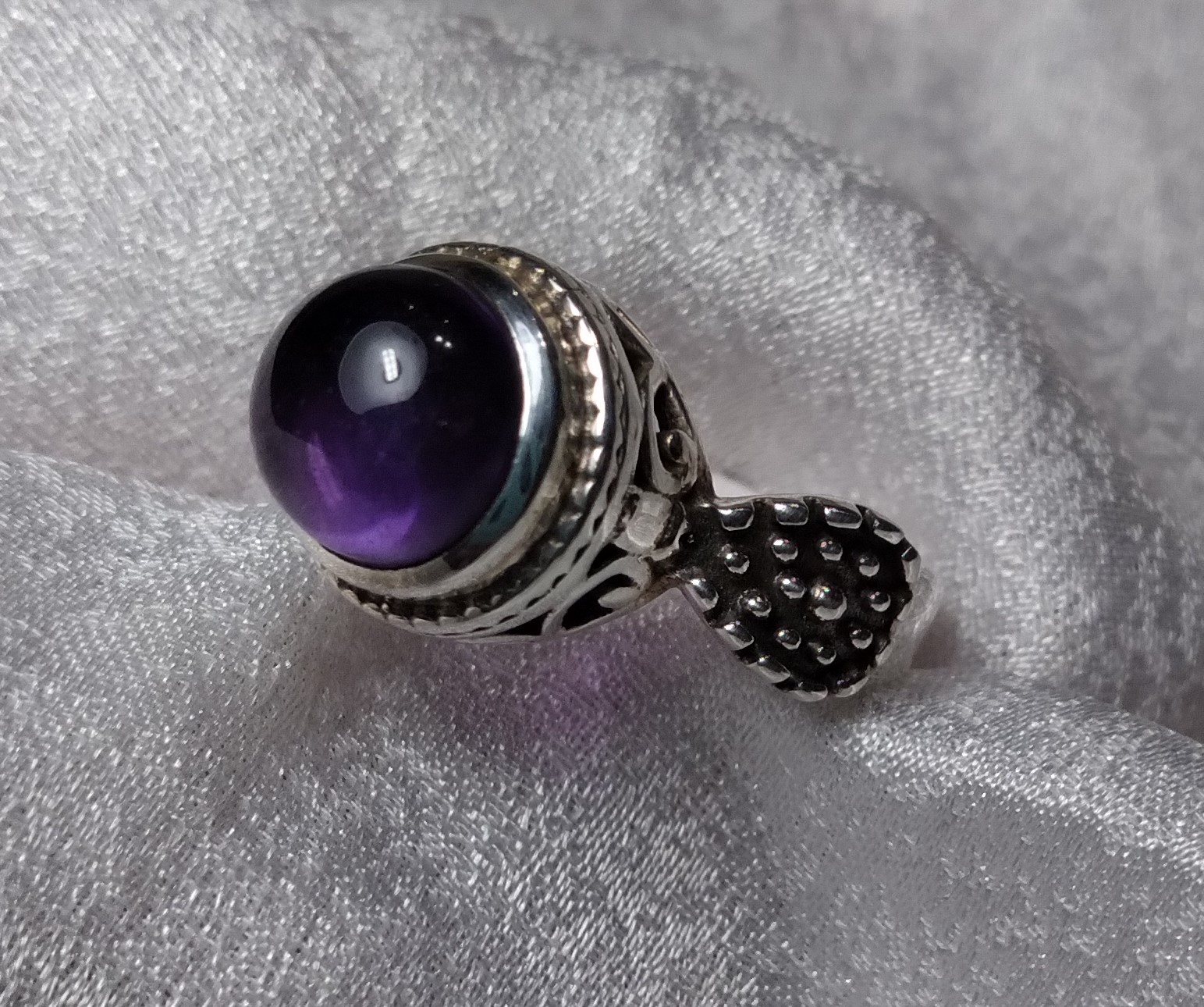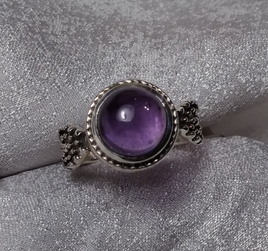 Deep purple Amethyst Cabochon ring sits tall. Filigree Bezel base with Oxidized, textured sides. Size 5