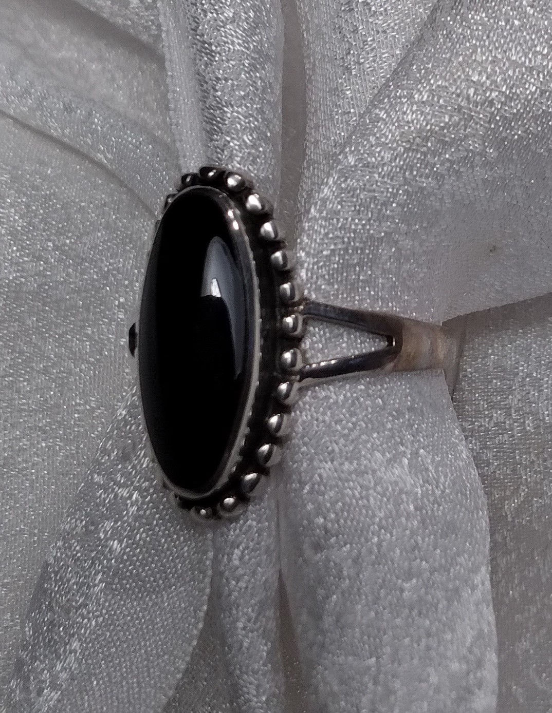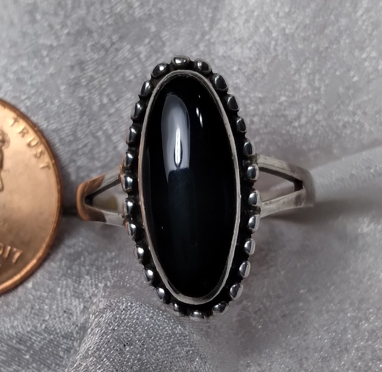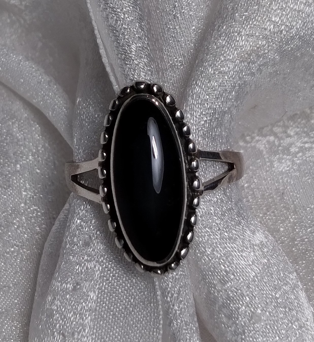 Black Onyx long Oval ring w/beaded framed bezel. Size 8.5