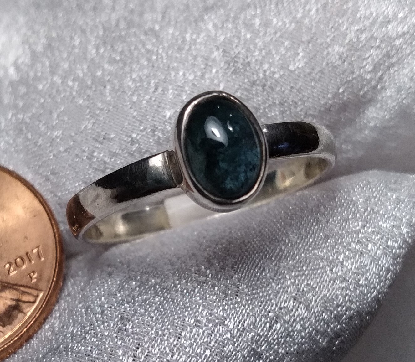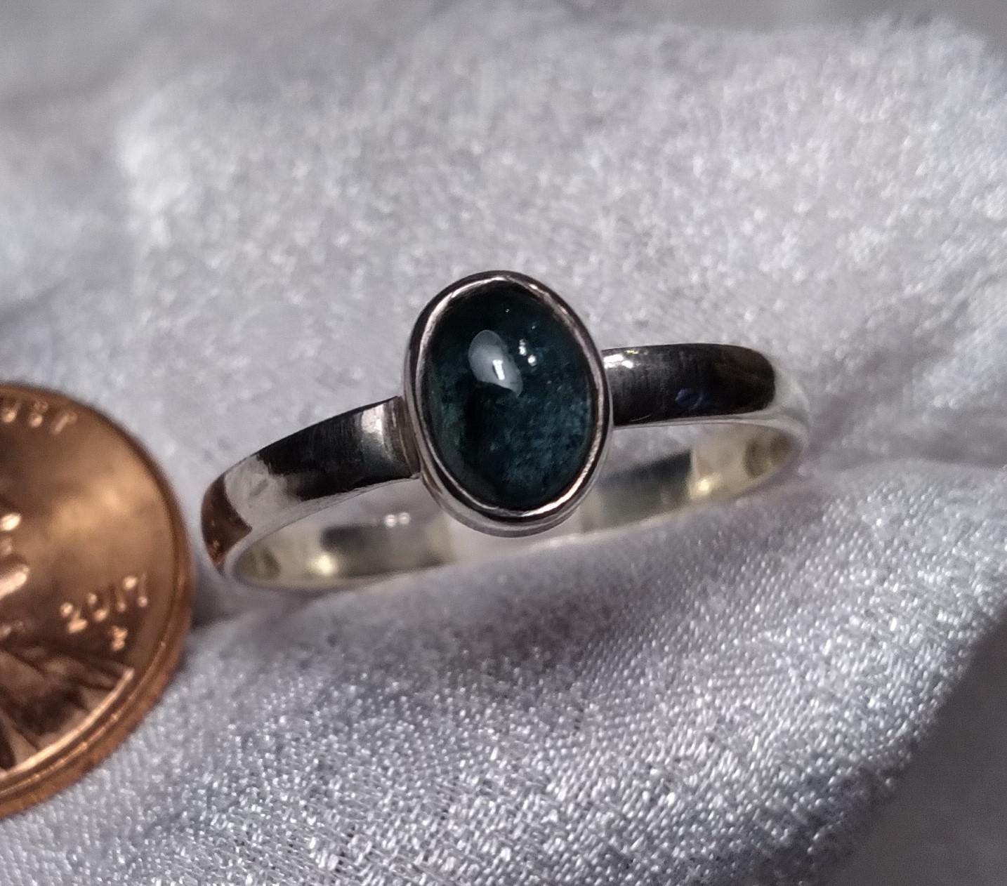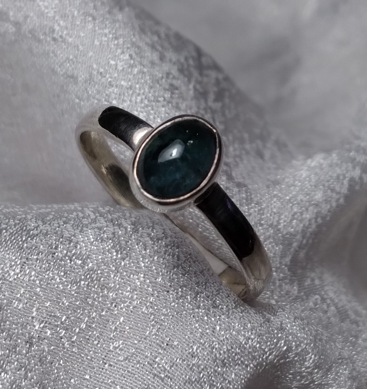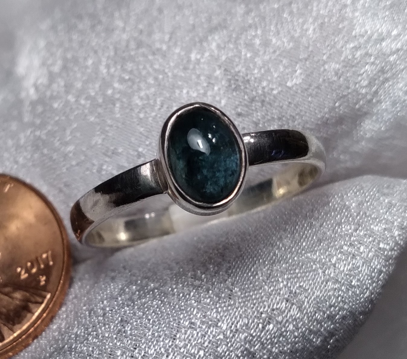 Petite Green Blue Tourmaline oval cabochon ring. Size 8.5.
