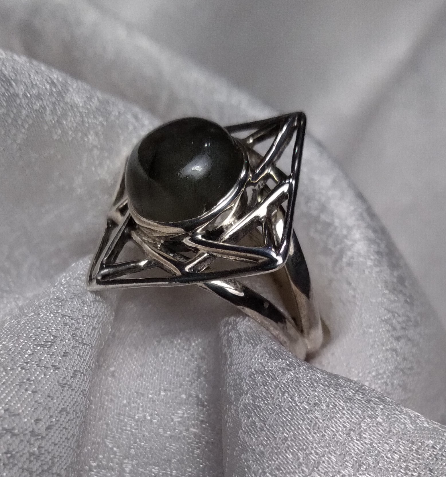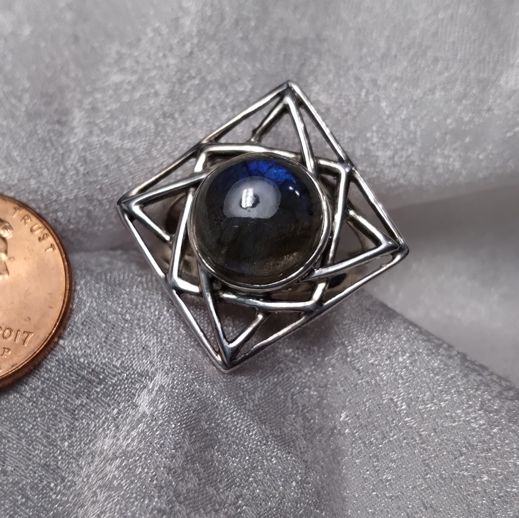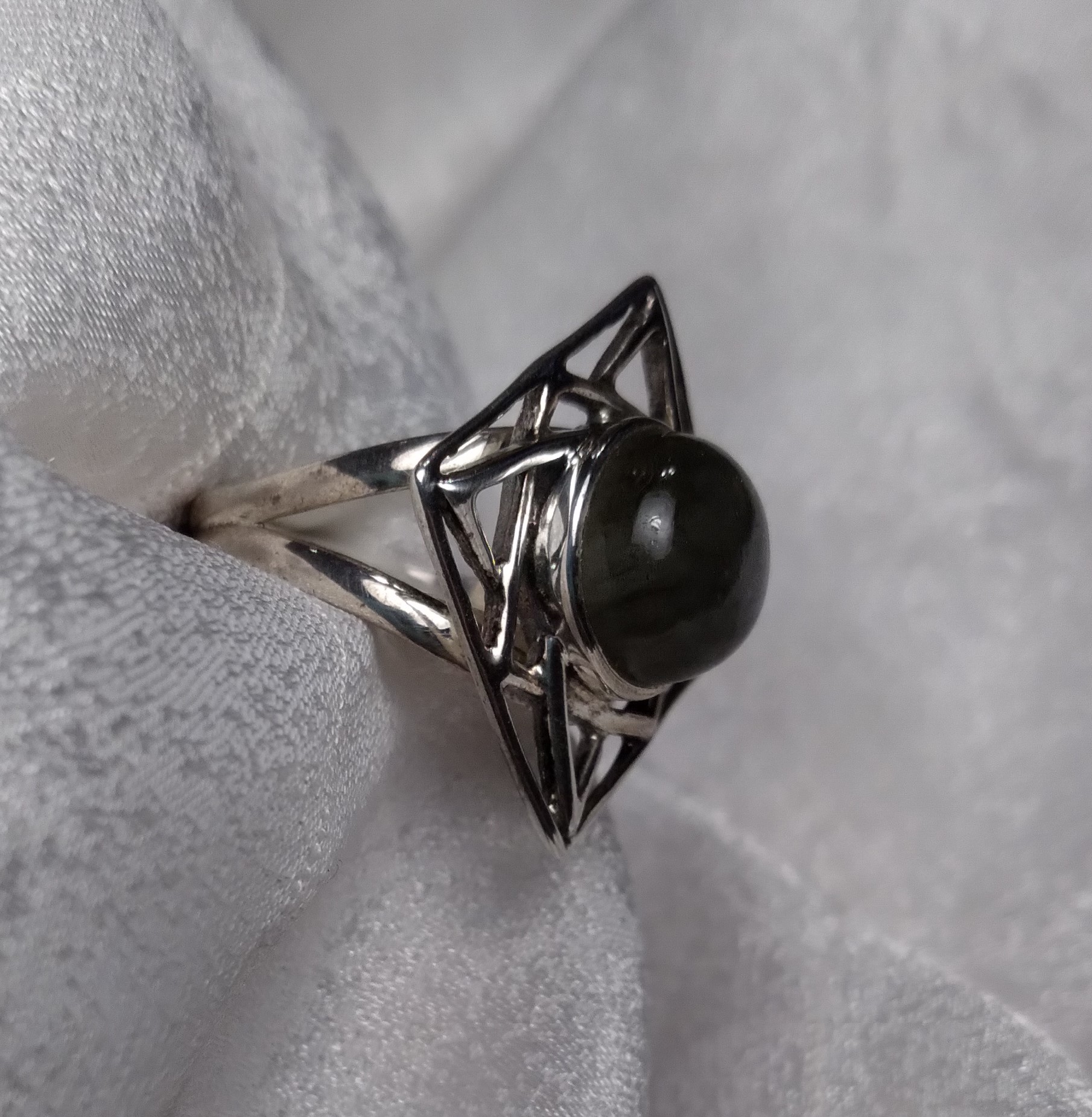 Labradorite square open plate bezel set split shank round cabochon ring. Size 7.75.