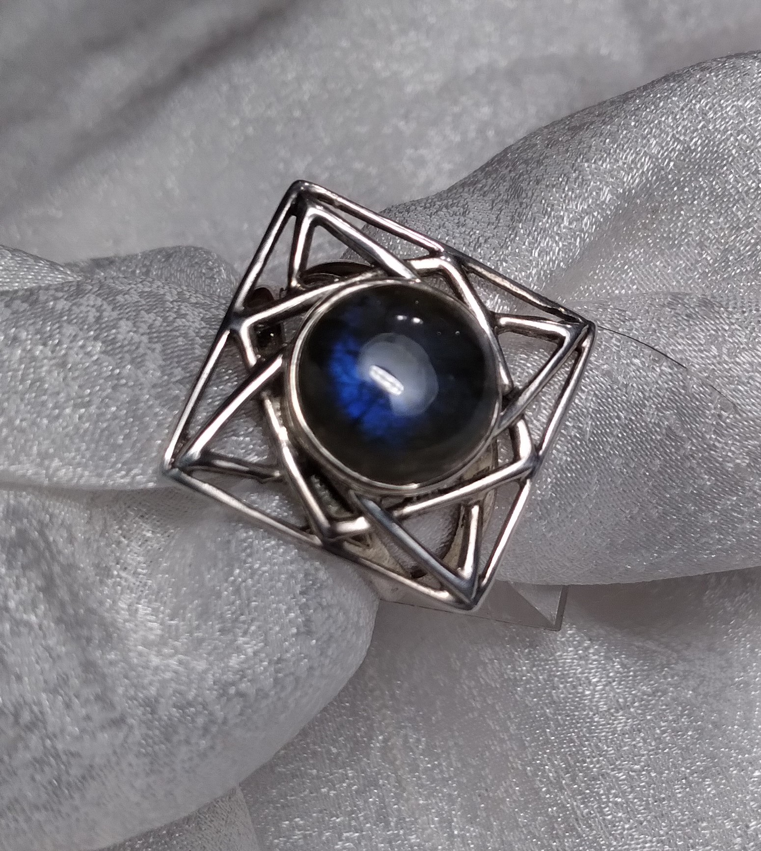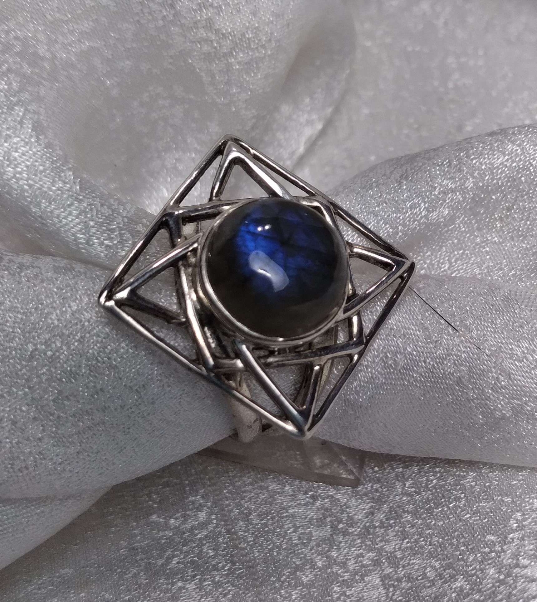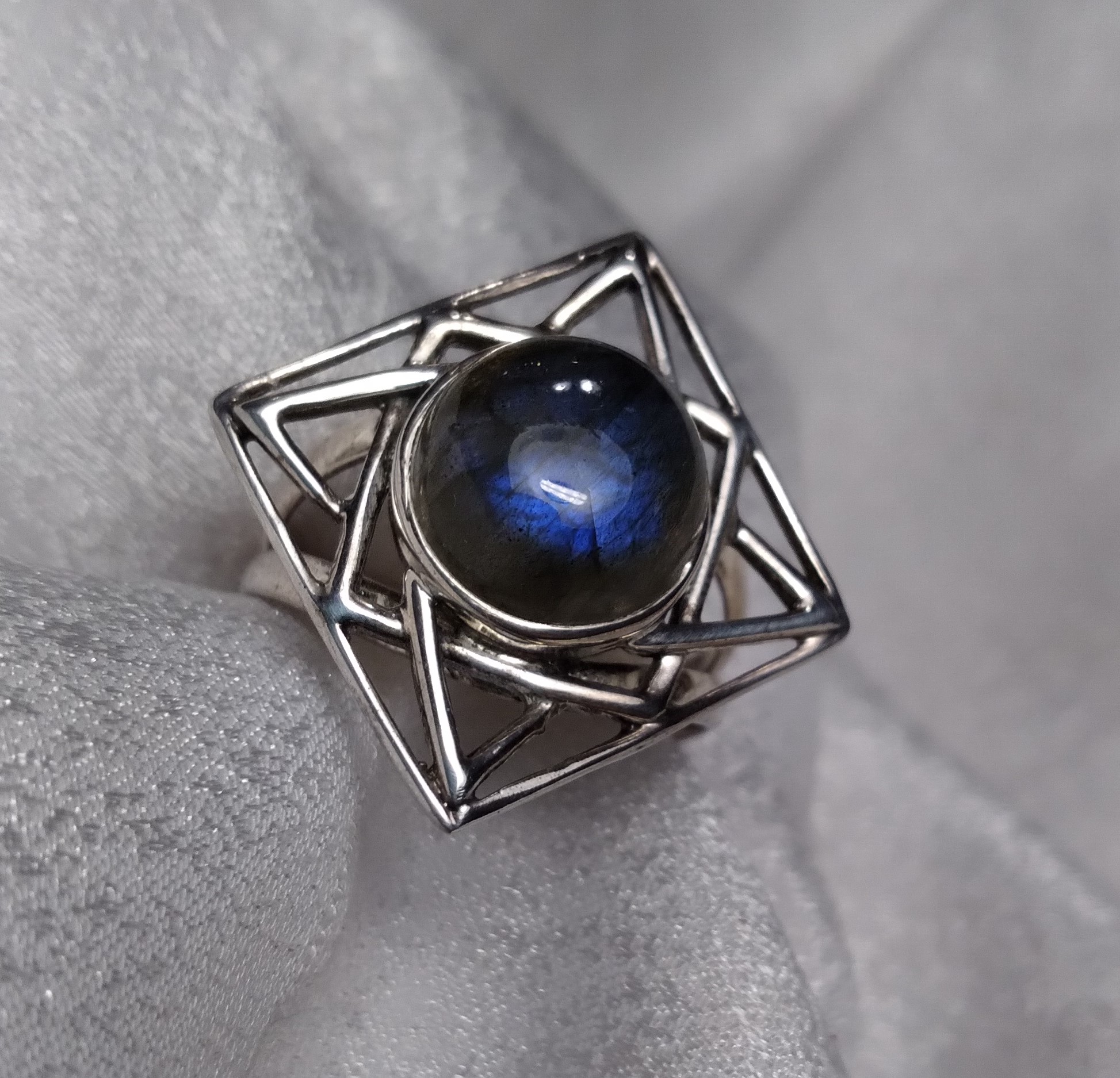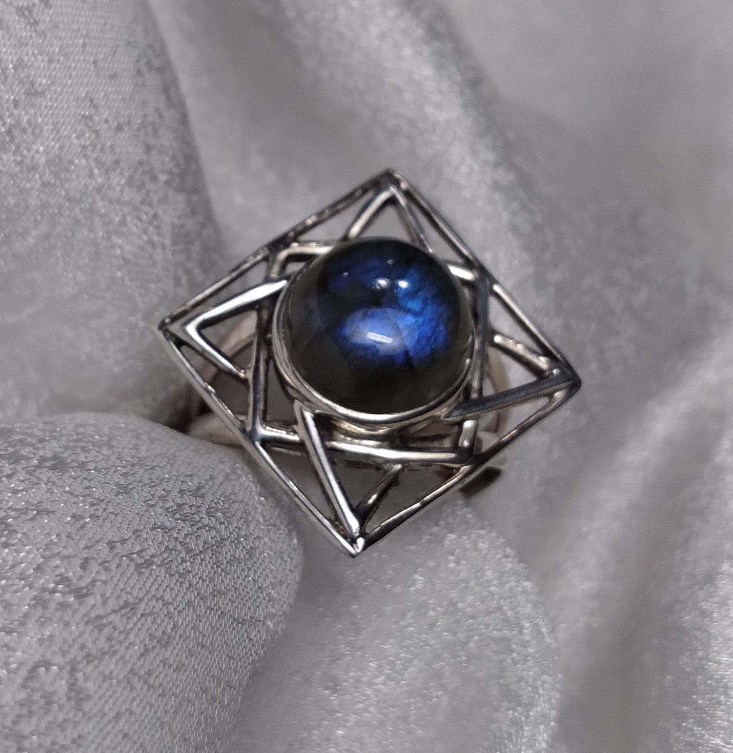 Labradorite square open plate bezel set split shank round cabochon ring. Size 7.75.