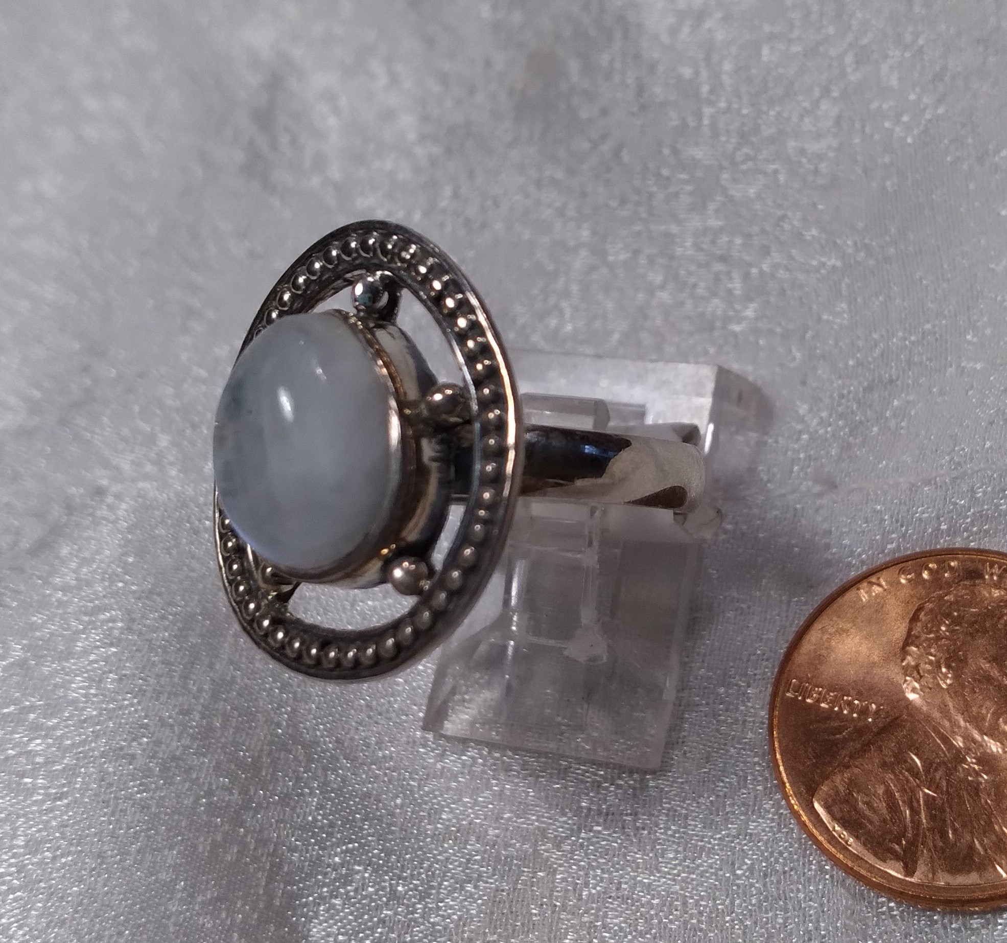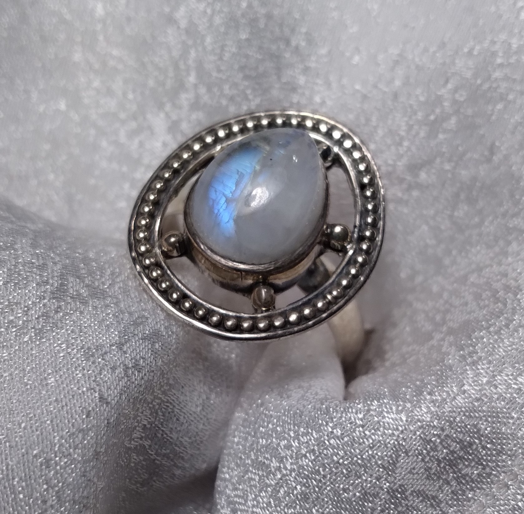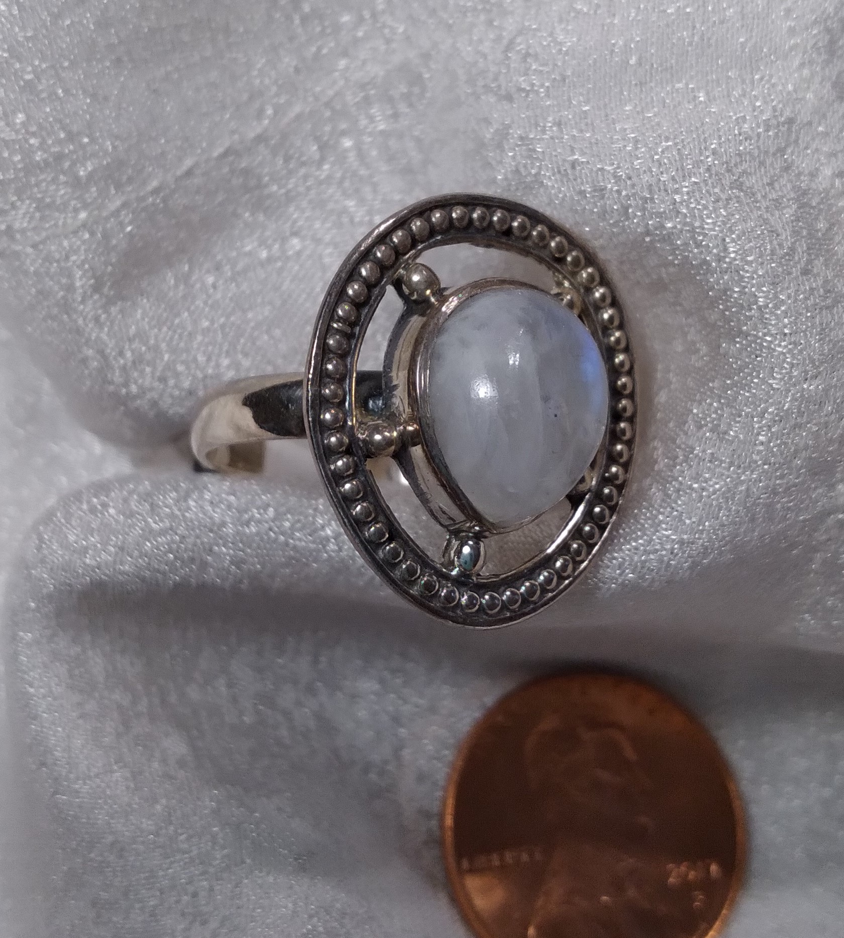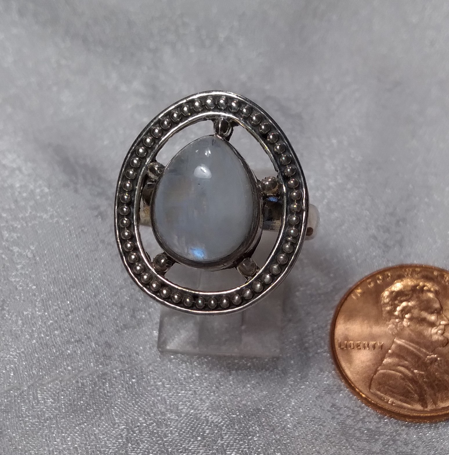 Pear shaped, Rainbow Moonstone open round plate bezel set ring. Size 8.