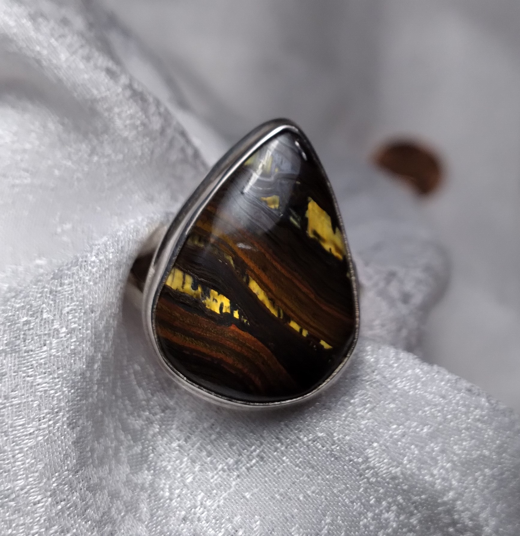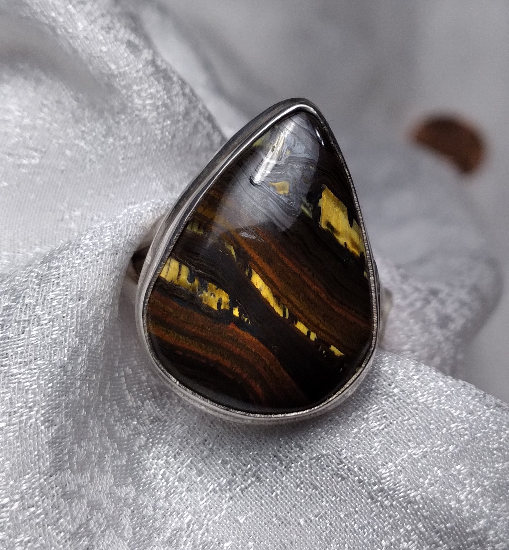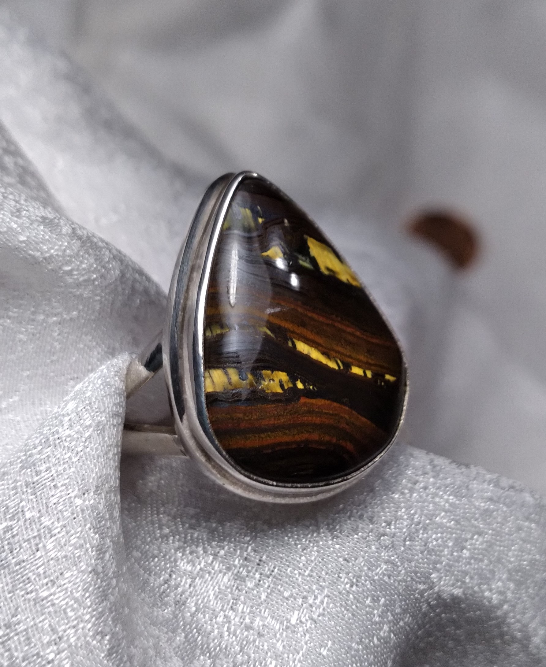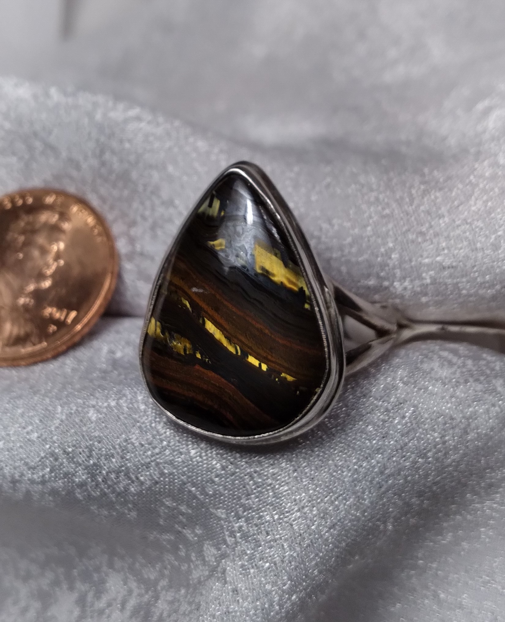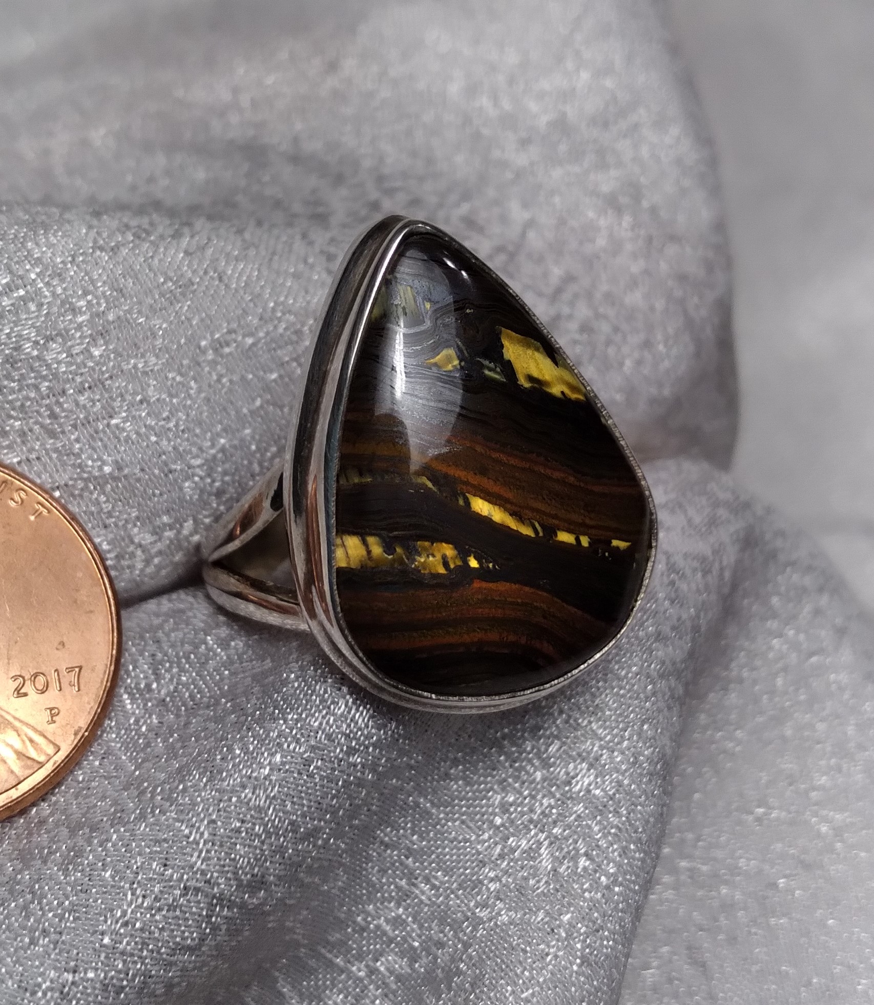 Layered, complex pear shaped step bezel set split shank Tiger Iron ring. Size 8.75.